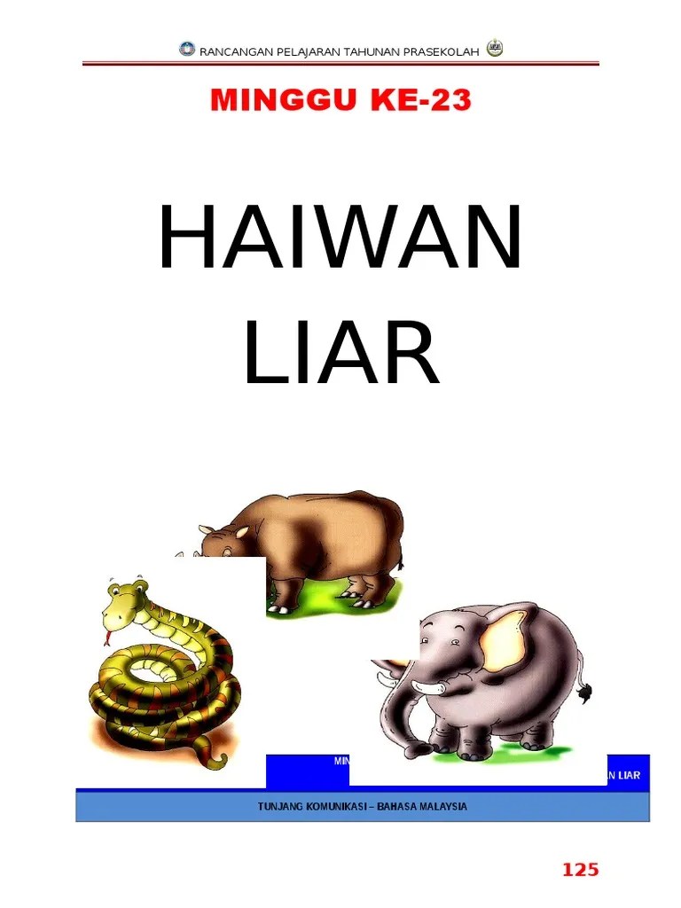 Gajah mempunyai belalai untuk mencari makan. Ini zirafah ini ular ini tapir ini kuda belang ini singa ini harimau ini gajah ini badak sumbu ini buaya ini . Haiwan liar merujuk kepada mereka yang hidup dalam persekitaran yang semula jadi. Mari mengenal dan menyebut nama haiwan liar. Gajah mempunyai belalai untuk mencari makan.